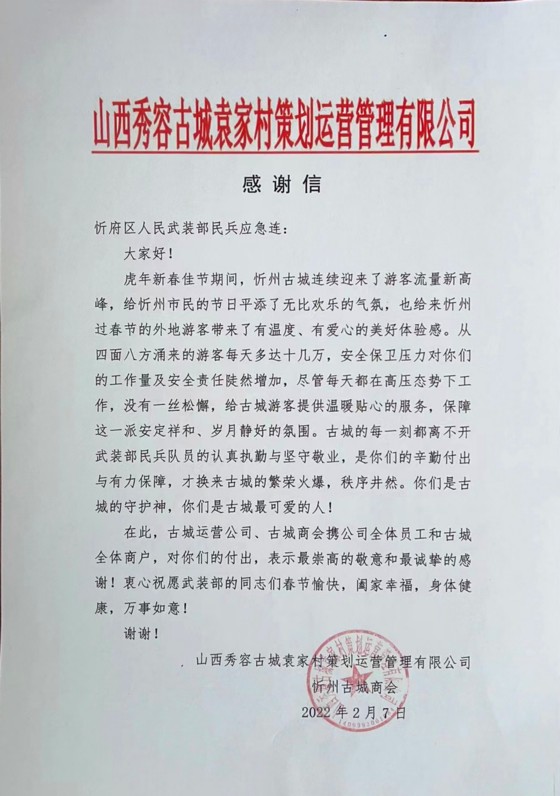 感謝信中,山西秀容古城袁家村策劃運營管理有限公司和忻州古城商會對物業(yè)公司民兵應急連在春節(jié)期間面對古城客流量增大,隊員們堅守崗位,圓滿完成安保任務給與了充分肯定和表示了崇高敬意,并致以衷心感謝和衷心祝愿!