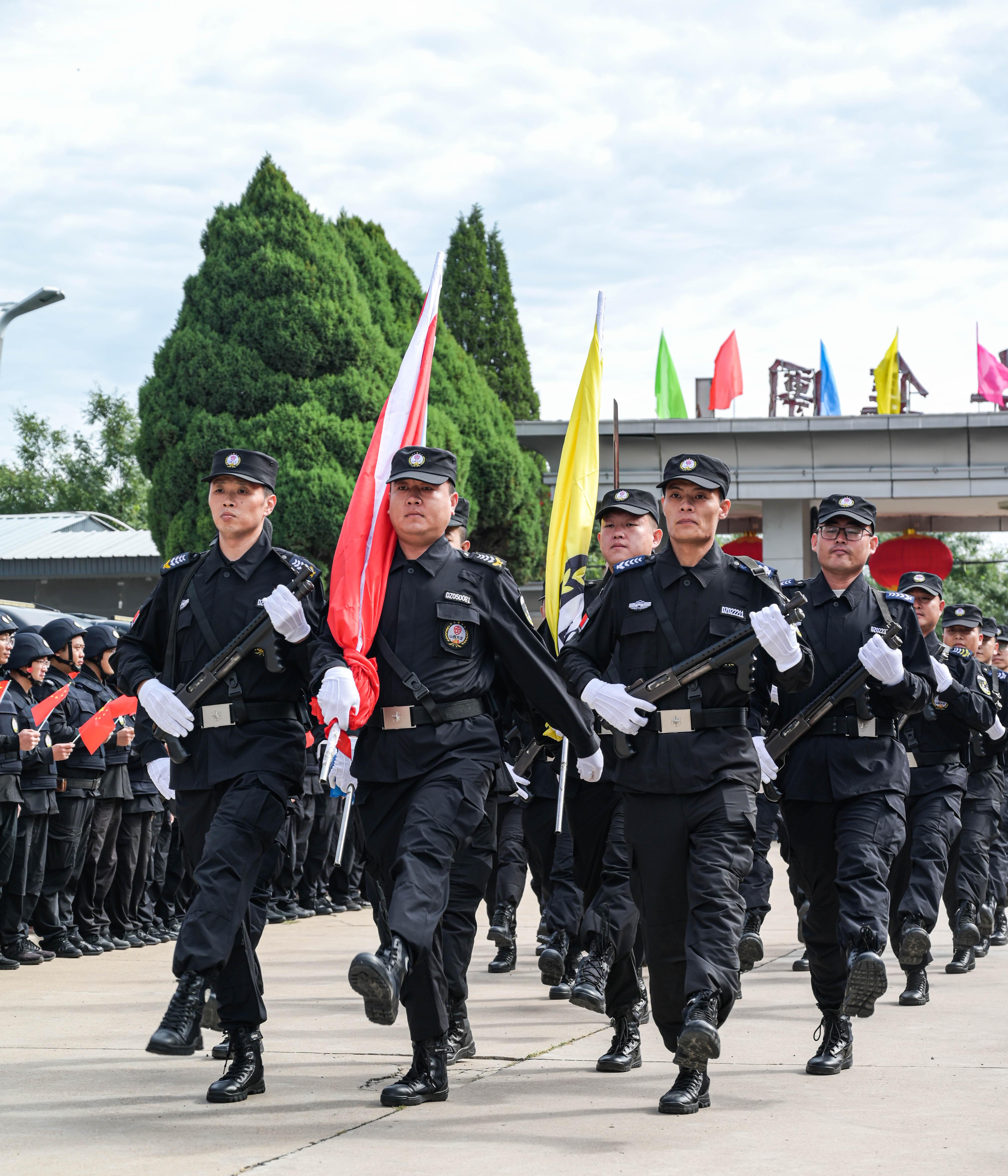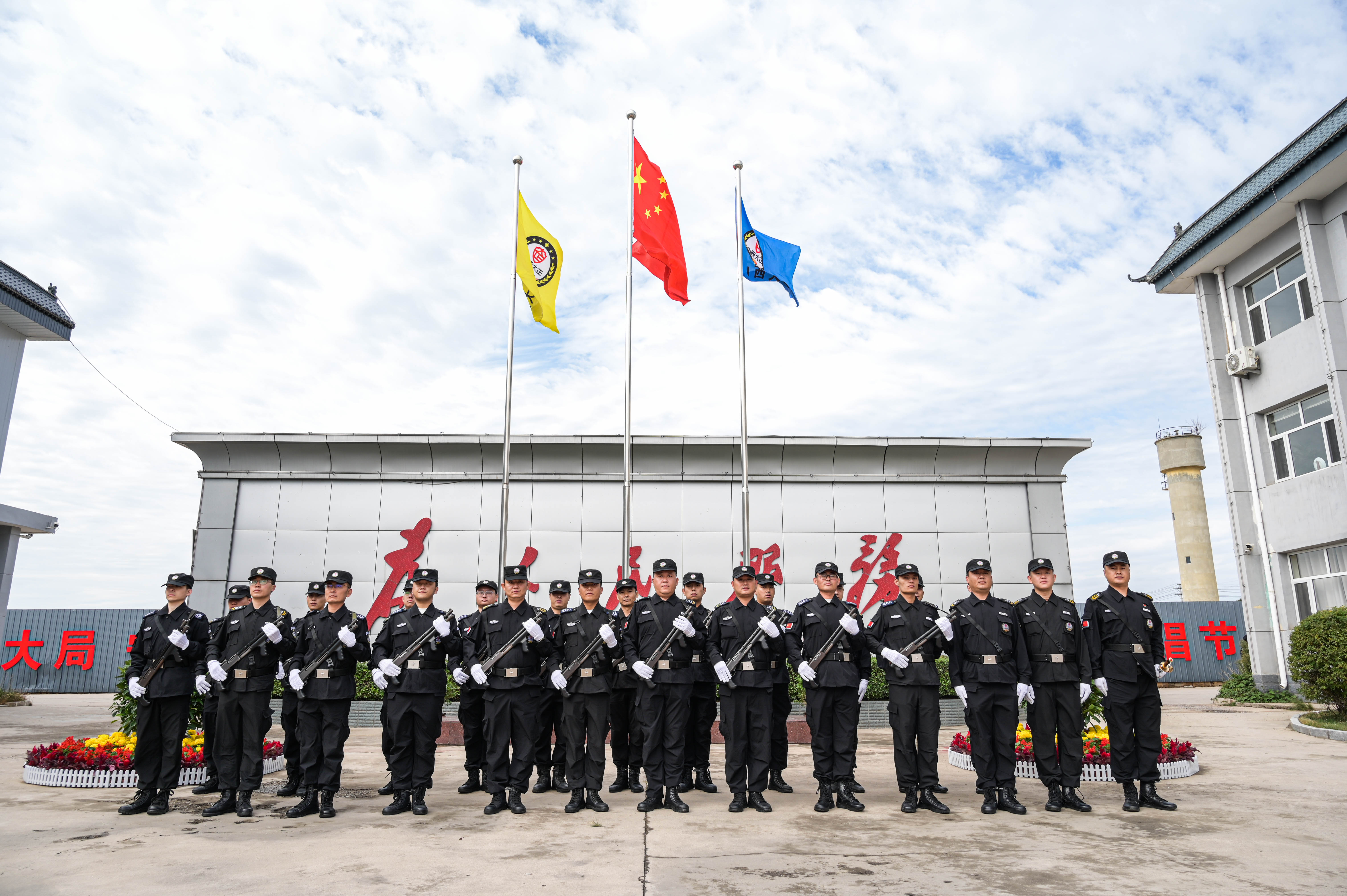 節(jié)日的公司院內(nèi)外,四周花團(tuán)錦簇,大門口燈籠高掛、彩旗飄揚(yáng),為節(jié)日增添了濃厚的喜慶氛圍。公司運(yùn)鈔車、巡邏車、運(yùn)兵車干凈整潔,排列在場地兩側(cè),升旗儀式更顯隆重。9時30分,集團(tuán)公司、各子公司領(lǐng)導(dǎo)和機(jī)關(guān)各部門、城區(qū)員工共300多人整齊列隊,懷著激動的心情,手持小國旗,臉上貼著愛國貼紙、洋溢幸福的笑容,眼神中充滿了對祖國的熱愛和對升旗儀式的期待。