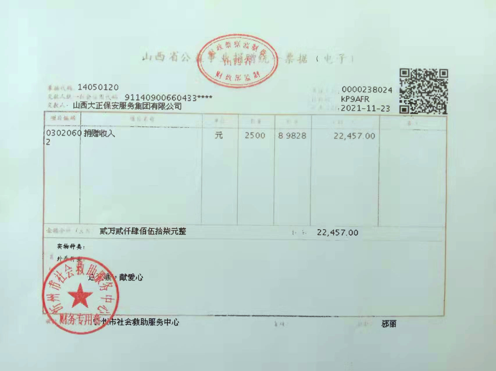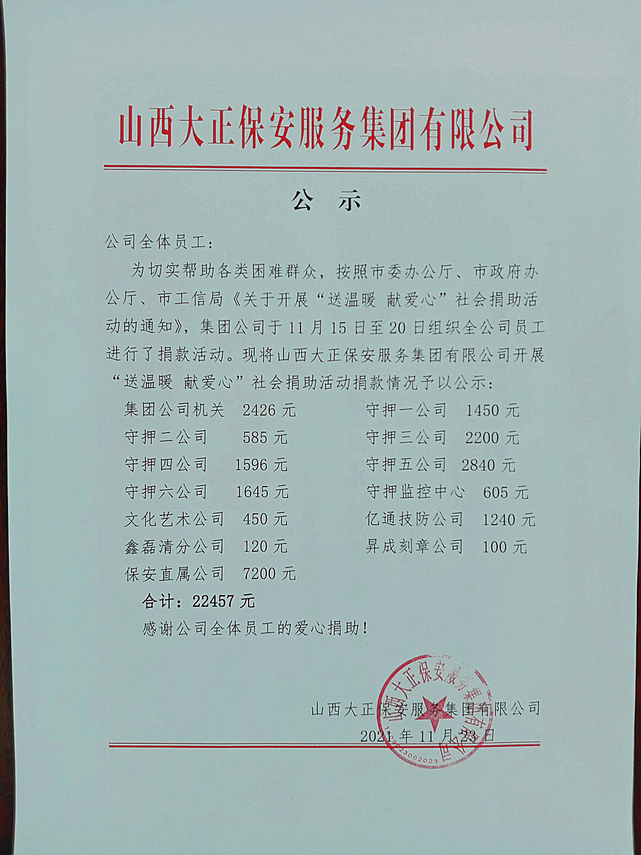 與此同時,公司基層各級黨組織和黨員領(lǐng)導(dǎo)干部充分發(fā)揮表率作用,帶頭宣傳動員,帶頭捐款獻(xiàn)愛心,以實(shí)際行動影響和帶動廣大干部職工在各所屬駐地相繼踴躍開展、參與了捐助活動。一筆筆捐款,代表著山西大正保安集團(tuán)廣大職工的一份份愛心,詮釋著大正保安人對社會的拳拳愛心,短短幾天時間,我公司共收到員工社會捐款22457元。