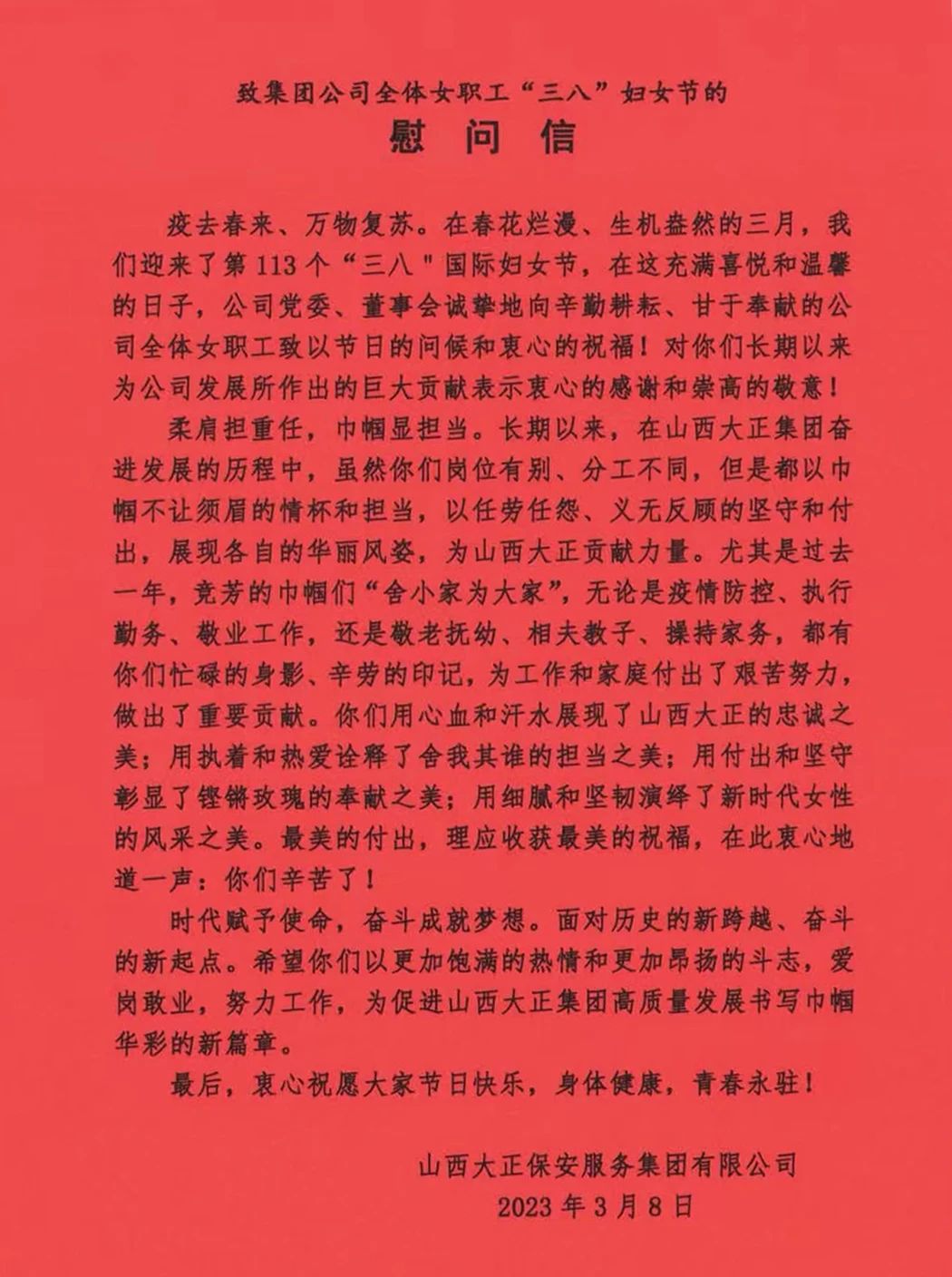 在第113個國際婦女節(jié)也是我國第100個婦女節(jié)到來之際,山西大正保安服務(wù)集團(tuán)有限公司向公司所有女同胞們致以節(jié)日的問候和美好的祝愿!向所有辛勤耕耘、默默奉獻(xiàn)在大正各個崗位上的姐妹們表示親切的問候、崇高的敬意!