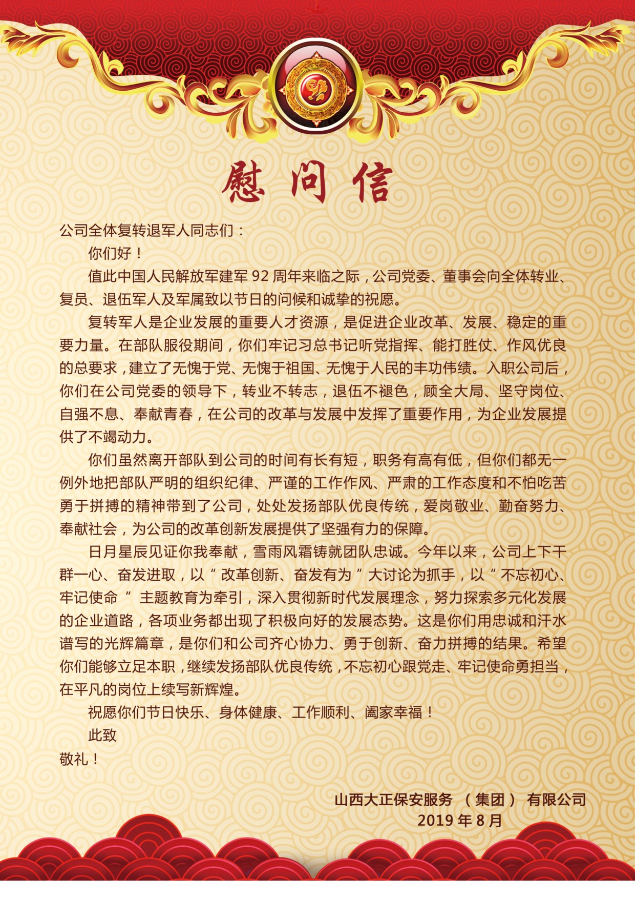 黨委委員、副總經(jīng)理趙培宏宣讀《慰問信》,信中談到:公司的每位復(fù)轉(zhuǎn)軍人都是企業(yè)發(fā)展的重要人才資源,是促進(jìn)企業(yè)改革、發(fā)展、穩(wěn)定的重要力量,處處發(fā)揚著部隊優(yōu)良傳統(tǒng),為公司的改革創(chuàng)新發(fā)展提供了堅強有力的保障。希望大家能夠以“改革創(chuàng)新、奮發(fā)有為”大討論為抓手,以“不忘初心、牢記使命”主題教育為牽引,立足本職,發(fā)揚部隊優(yōu)良傳統(tǒng),不忘初心跟黨走、牢記使命勇?lián)?dāng),在平凡的崗位上續(xù)寫新輝煌。