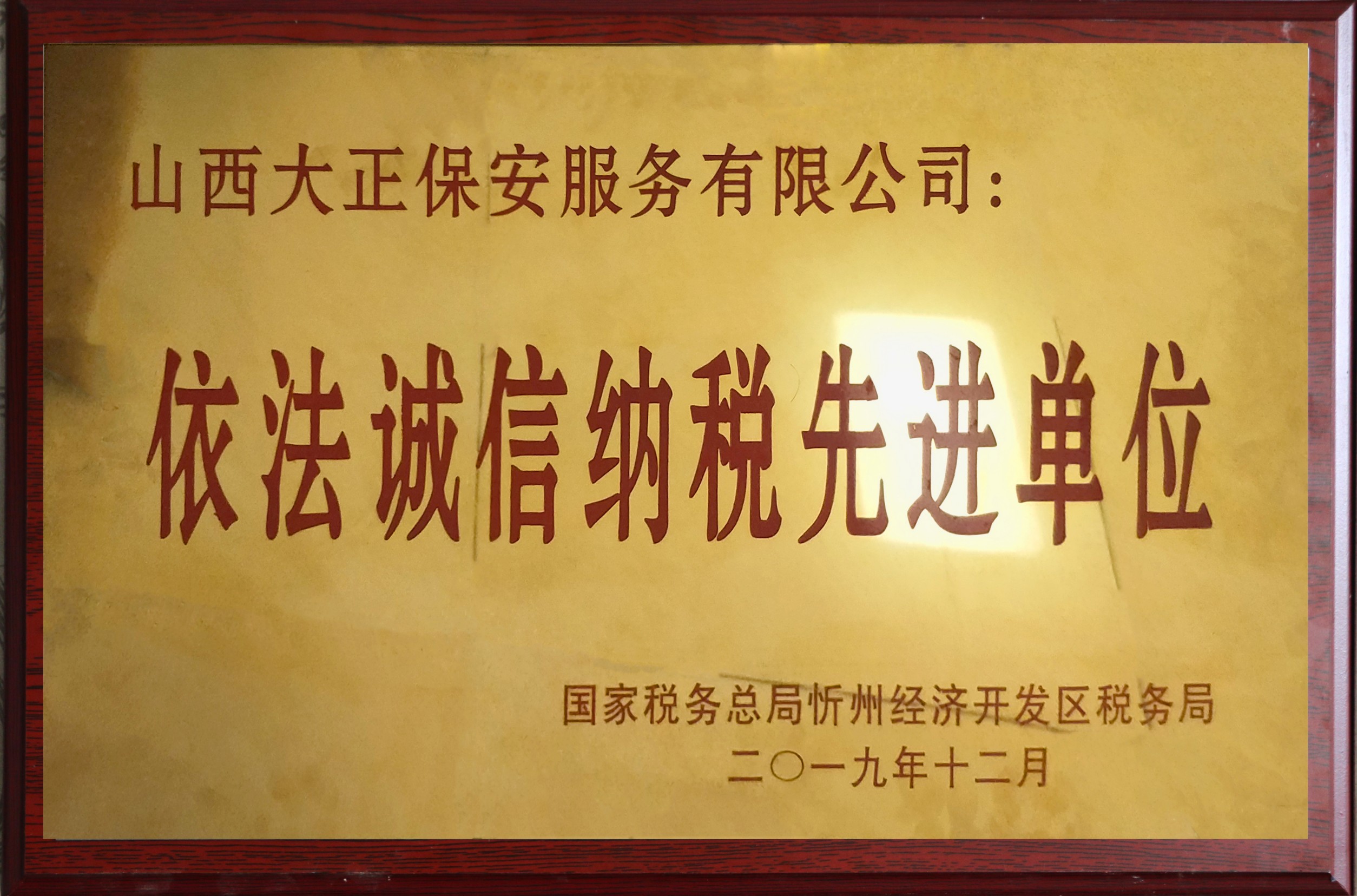12月15日,國家稅務(wù)總局忻州經(jīng)濟(jì)開發(fā)區(qū)稅務(wù)局舉行2019年度“依法誠信納稅先進(jìn)單位”頒獎儀式。山西大正保安服務(wù)(集團(tuán))有限公司等9家企業(yè)榮獲2019年度“依法誠信納稅先進(jìn)單位”稱號。集團(tuán)公司黨委委員、副總經(jīng)理趙培宏代表公司參加儀式并上臺領(lǐng)獎。