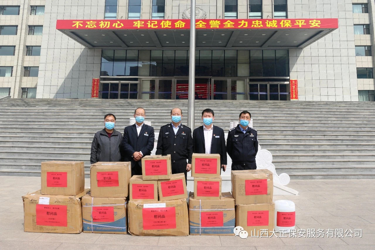 3月31日,山西大正保安服務(wù)(集團(tuán))有限公司黨委委員、副總經(jīng)理趙培宏、副總經(jīng)理王明生領(lǐng)導(dǎo)一行,專(zhuān)程來(lái)到市公安局,捐贈(zèng)了醫(yī)用口罩12000、防護(hù)服200套、護(hù)目鏡500個(gè)、消毒液80㎏、醫(yī)用酒精25㎏,表達(dá)公司和干部職工對(duì)公安民警疫情防控的支持;對(duì)警保同心、聯(lián)手抗疫的信心、決心;對(duì)廣大公安民警健康的關(guān)愛(ài)。忻州市公安局副局長(zhǎng)王雷接過(guò)物資后,代表市局對(duì)大正集團(tuán)公司的捐贈(zèng)表示感謝。