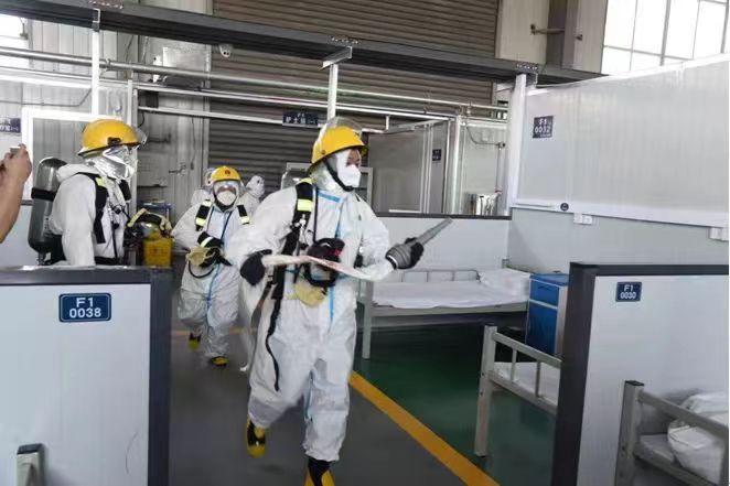 上午10點(diǎn)整,消防演練正式開始,在接到消防中控室的指令后,方艙醫(yī)院1號(hào)艙29床發(fā)生火情,全體隊(duì)員迅速穿戴整齊消防服和防護(hù)服在預(yù)定時(shí)間內(nèi)到達(dá)了演練火災(zāi)現(xiàn)場,執(zhí)行了打開消防栓箱門拉水帶、擰瞄子、開閥門、緊急疏散病人進(jìn)行警戒撲救滅火等演練科目。消防演練結(jié)束后,全體隊(duì)員迅速進(jìn)入反恐應(yīng)急演練狀態(tài),根據(jù)演練科目內(nèi)容,其中一名隊(duì)員扮演患者情緒失控人員,手持兇器與醫(yī)護(hù)人員發(fā)生爭斗,反恐隊(duì)員收到指令后在最短時(shí)間內(nèi)攜帶防暴裝備進(jìn)入現(xiàn)場,到達(dá)現(xiàn)場與鬧事人溝通無效后,反恐隊(duì)員迅速采取措施將其制服,圓滿完成科目內(nèi)容。